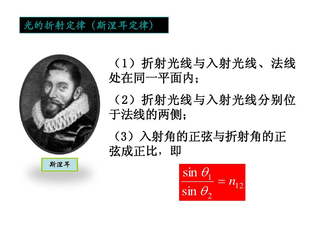 1637年,法國人R.笛卡兒在《折光學》一書中首次公布了具有現代形式正弦之比的規律。與光的反射定律一樣,最初由實驗確定的折射定律可根據費馬原理、惠更斯原理或光的電磁理論證明之。(上述光的折射定律只適用于由各向同性介質構成的靜止界面。)