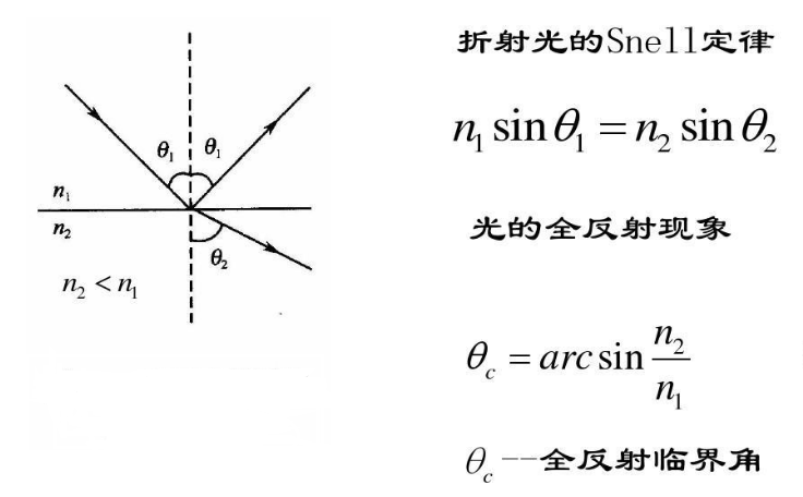 ?斯涅爾最早發現了光的折射定律,從而使幾何光學的精確計算成為了可能。其中入射光和折射光位于同一個平面上,并且與界面法線的夾角滿足如下關系: