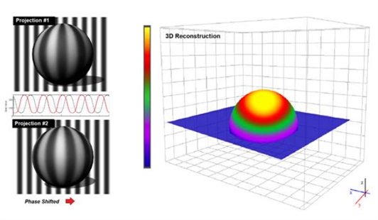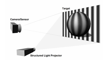圖1:規(guī)則的條紋圖案投射到球上。球的圓形表面使條紋變形,并且變形的圖像被相機捕獲以進行分析和對象重建。
