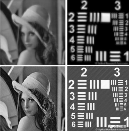 將傳統(tǒng)相機(jī)的光圈改為編碼光圈,能夠使系統(tǒng)在保證高分辨率成像的情況下,同時(shí)獲取了物方空間深度信息,通過后期計(jì)算處理的方法實(shí)現(xiàn)深度信息的提取,最終得到全焦點(diǎn)圖像。針對(duì)衍射光學(xué)元件的色差問題,利用跨通道反卷積算法實(shí)現(xiàn)光學(xué)系統(tǒng)中色差的校正,下圖為色差校正前后對(duì)比,如下圖三所示: